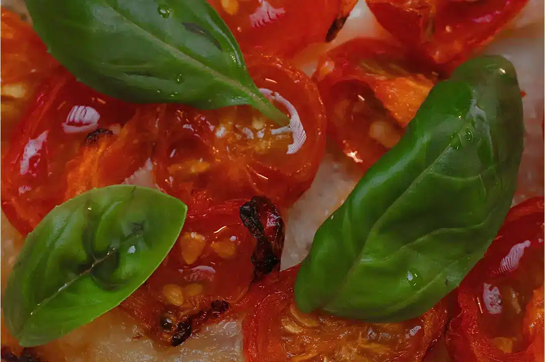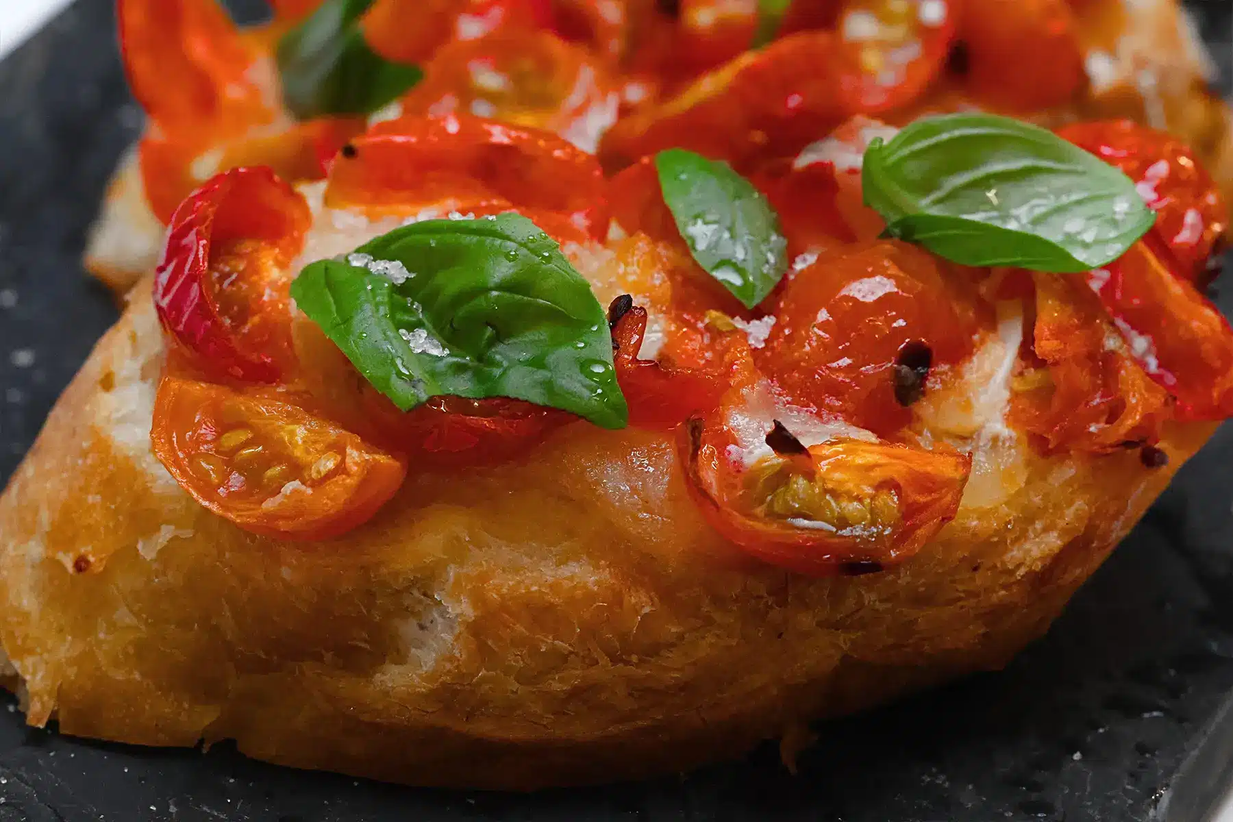 Top each slice with fresh mozzarella and diced tomatoes. Season with salt and pepper. Garnish with fresh basil leaves and drizzle with a little olive oil.